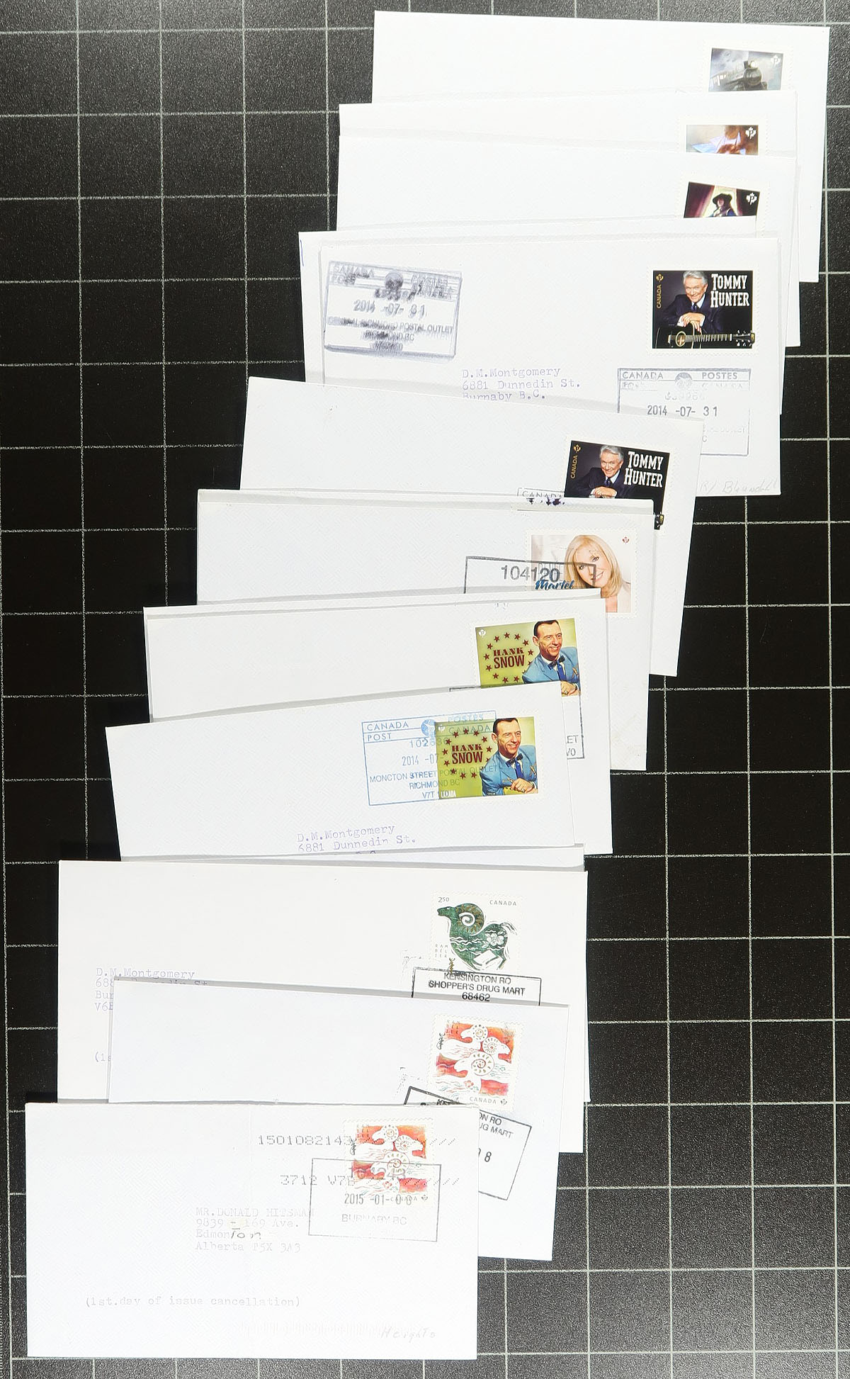 British Columbia Postmarks / FDC #2. Group of roughly 400 Canada first day covers from the years 2009 to 2015 noting singles, plate blocks, and souvenir sheet frankings. The lot contains no official first day covers, as the collector meticulously collected first day covers with Vancouver and lower mainland postmarks, with most pages indicating the variety of postal outlets. Some issues have up to 10 first day covers (from a variety of different cities or outlets within each city). Ideal for the first day cover or British Columbia postmark collector, as this would be a near impossible collection to duplicate. Estimate =
