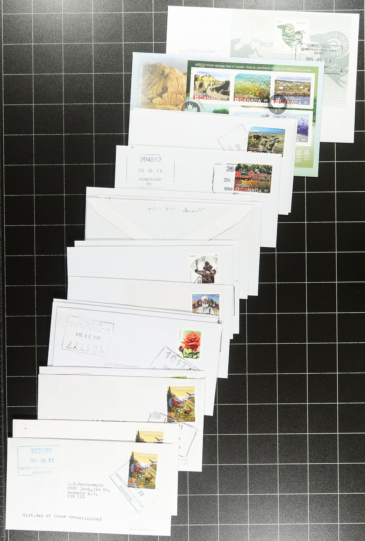 British Columbia Postmarks / FDC #2. Group of roughly 400 Canada first day covers from the years 2009 to 2015 noting singles, plate blocks, and souvenir sheet frankings. The lot contains no official first day covers, as the collector meticulously collected first day covers with Vancouver and lower mainland postmarks, with most pages indicating the variety of postal outlets. Some issues have up to 10 first day covers (from a variety of different cities or outlets within each city). Ideal for the first day cover or British Columbia postmark collector, as this would be a near impossible collection to duplicate. Estimate =