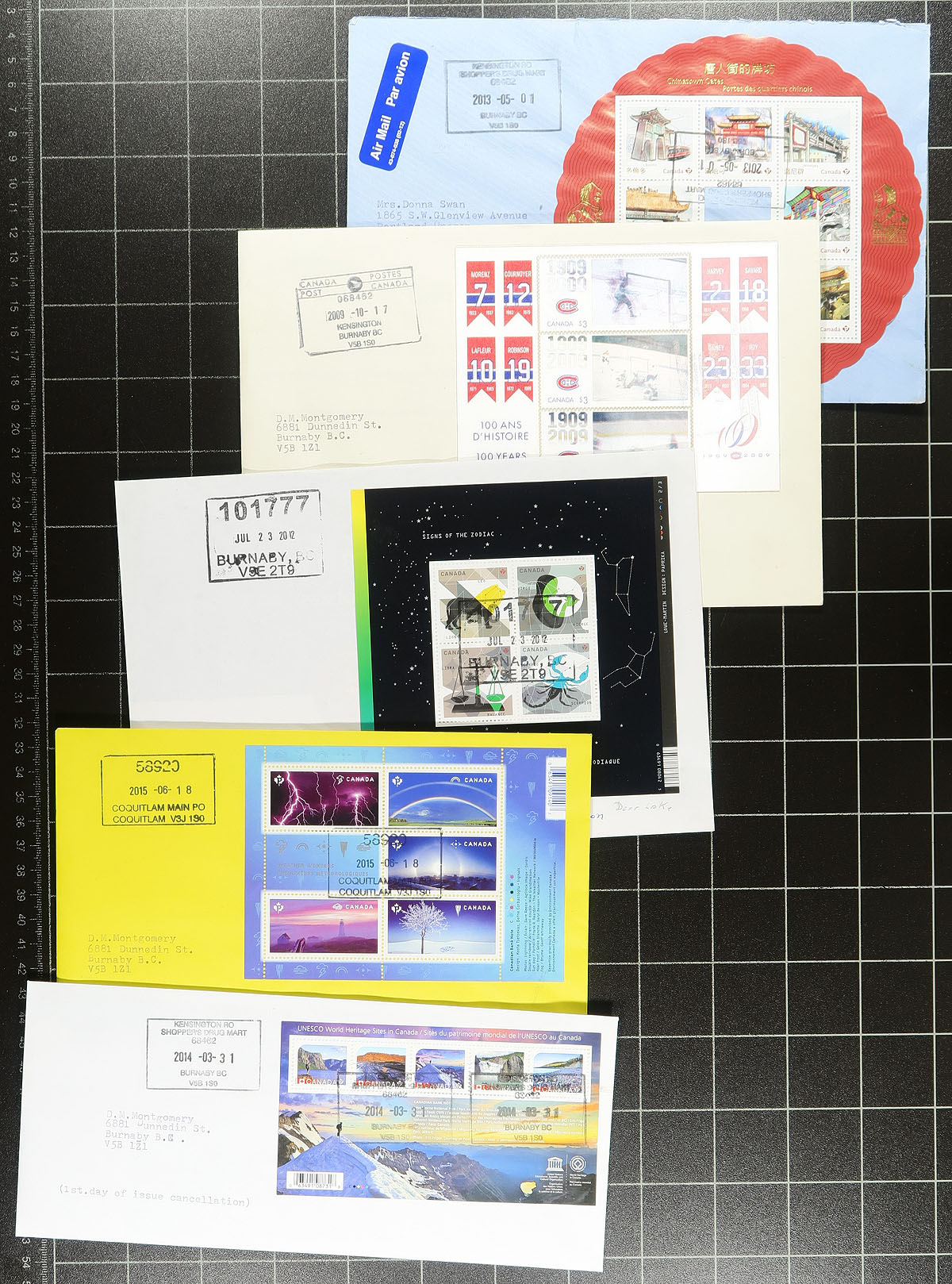 British Columbia Postmarks / FDC #2. Group of roughly 400 Canada first day covers from the years 2009 to 2015 noting singles, plate blocks, and souvenir sheet frankings. The lot contains no official first day covers, as the collector meticulously collected first day covers with Vancouver and lower mainland postmarks, with most pages indicating the variety of postal outlets. Some issues have up to 10 first day covers (from a variety of different cities or outlets within each city). Ideal for the first day cover or British Columbia postmark collector, as this would be a near impossible collection to duplicate. Estimate =