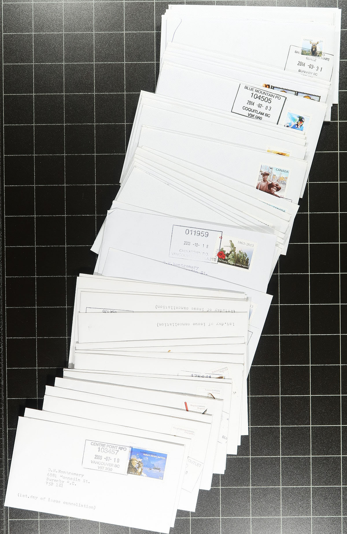 British Columbia Postmarks / FDC #2. Group of roughly 400 Canada first day covers from the years 2009 to 2015 noting singles, plate blocks, and souvenir sheet frankings. The lot contains no official first day covers, as the collector meticulously collected first day covers with Vancouver and lower mainland postmarks, with most pages indicating the variety of postal outlets. Some issues have up to 10 first day covers (from a variety of different cities or outlets within each city). Ideal for the first day cover or British Columbia postmark collector, as this would be a near impossible collection to duplicate. Estimate =
