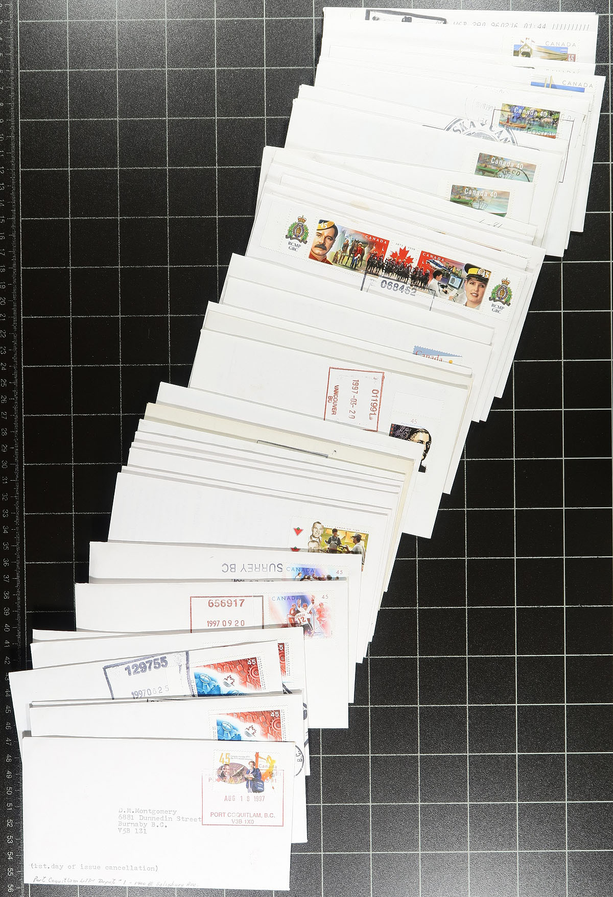 British Columbia Postmarks. Interesting collection of a few hundred Canada first day covers, all with British Columbia postmarks. The majority of covers range from 1996 to 1999, where the collector created 3-5 first day covers for most issues in period, all with what appears Lower Mainland postmarks from various postal outlets including cities New Westminster, Vancouver, Burnaby, North and West Vancouver, Langley, and Coquitlam. The majority of frankings are singles, but note a few plate blocks and souvenir sheets. A most interesting collection that would be missing from first day cover collections, and should pose some interest for modern BC postmarks collectors. Estimate =