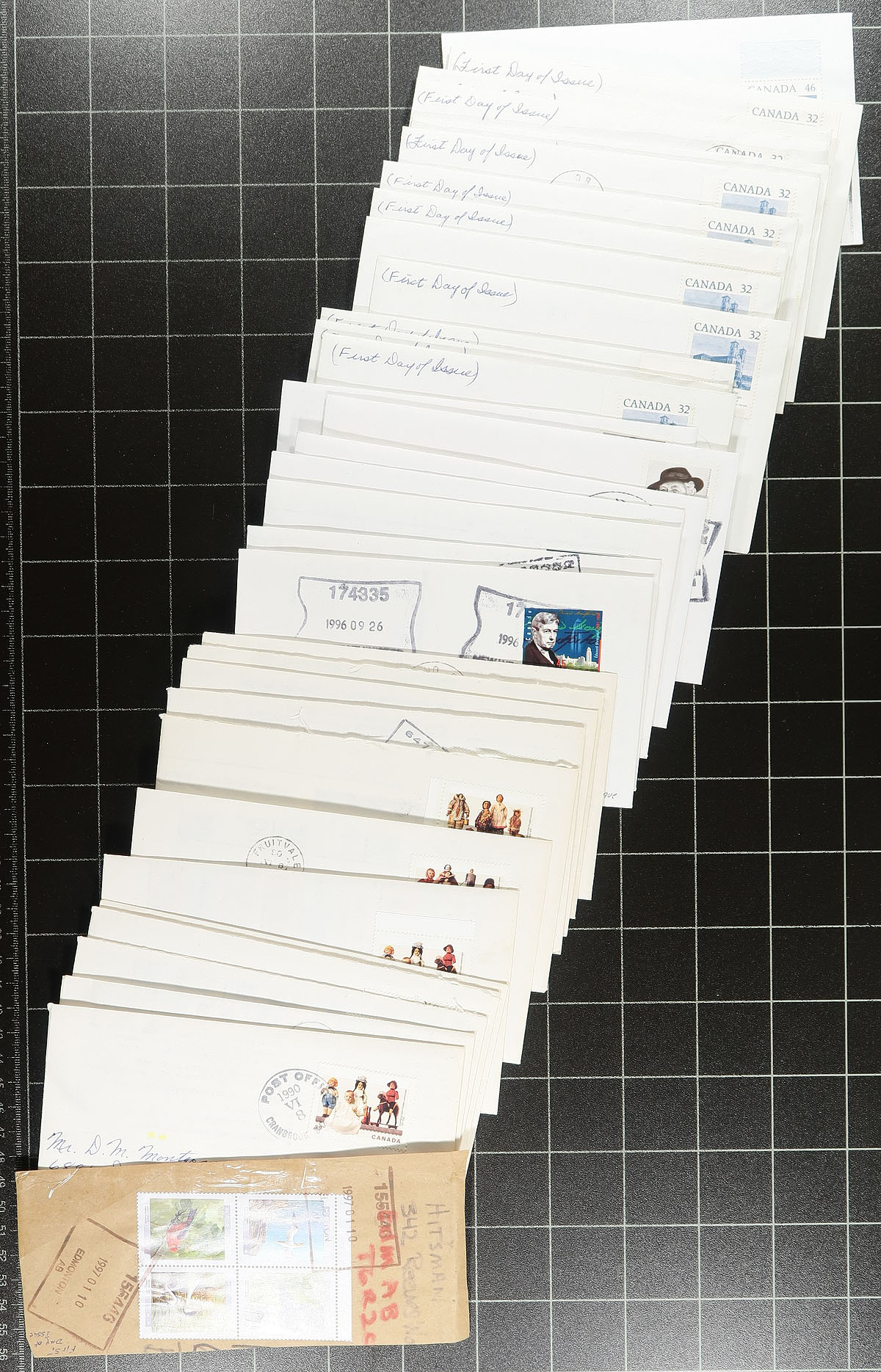 British Columbia Postmarks. Interesting collection of a few hundred Canada first day covers, all with British Columbia postmarks. The majority of covers range from 1996 to 1999, where the collector created 3-5 first day covers for most issues in period, all with what appears Lower Mainland postmarks from various postal outlets including cities New Westminster, Vancouver, Burnaby, North and West Vancouver, Langley, and Coquitlam. The majority of frankings are singles, but note a few plate blocks and souvenir sheets. A most interesting collection that would be missing from first day cover collections, and should pose some interest for modern BC postmarks collectors. Estimate =