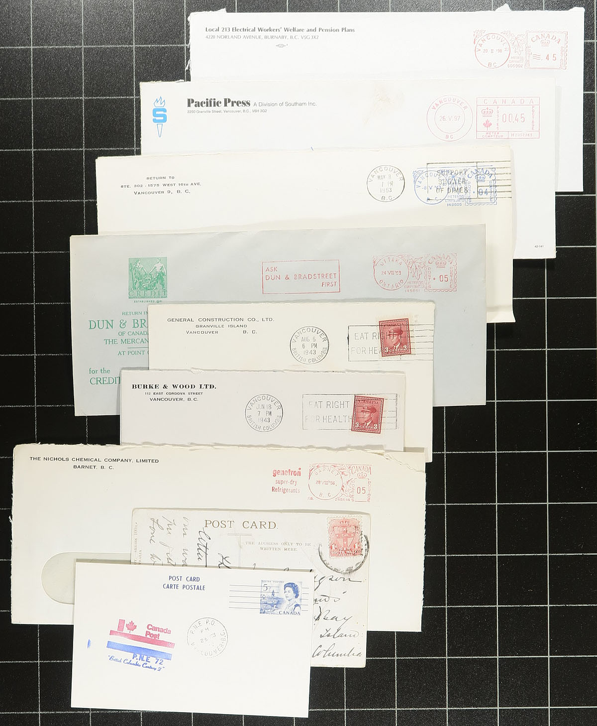 British Columbia Postmarks. Accumulation of roughly 600 covers collected for British Columbia postmarks, generally ranging from the 1950's to the 1980's. A cursory check of material indicated a number of corner advertising covers (almost all #10 sized envelopes), mostly from larger towns, along with meter mail (including a few nice slogan types), and more. Postmarks include cds, duplex, slogan, POCON, Klussendorf and a few other types. Most mail seems to be from Vancouver or Victoria, but have different corner advertising, frankings, etc., still duplication can run from 3 to 5 or more for some items. A nice lot for the British Columbia collector, a few faults to be expected as is the nature of commercial mail, overall a little mixed to very fine. Estimate =