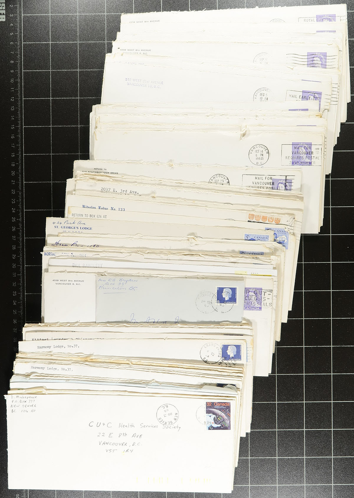 British Columbia Postmarks. Accumulation of roughly 600 covers collected for British Columbia postmarks, generally ranging from the 1950's to the 1980's. A cursory check of material indicated a number of corner advertising covers (almost all #10 sized envelopes), mostly from larger towns, along with meter mail (including a few nice slogan types), and more. Postmarks include cds, duplex, slogan, POCON, Klussendorf and a few other types. Most mail seems to be from Vancouver or Victoria, but have different corner advertising, frankings, etc., still duplication can run from 3 to 5 or more for some items. A nice lot for the British Columbia collector, a few faults to be expected as is the nature of commercial mail, overall a little mixed to very fine. Estimate =