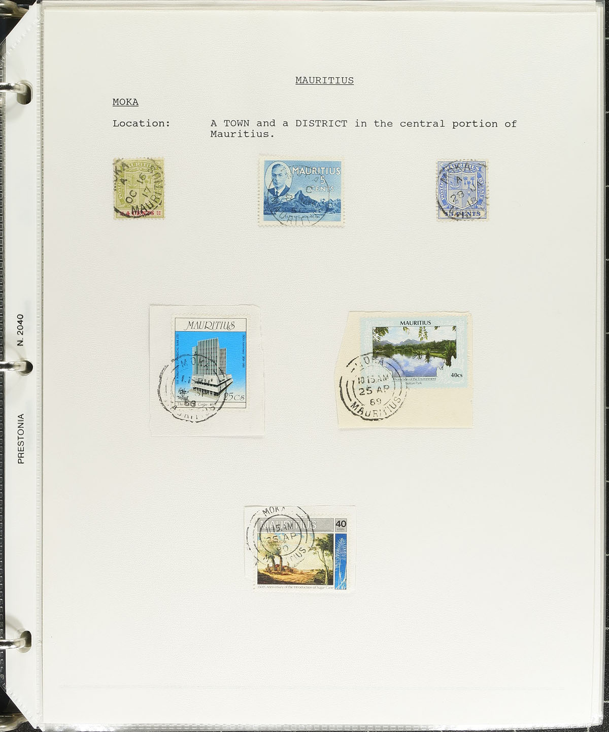 Postmark Study. A lovely, and in depth collection of Mauritius town cancels, 1880's-1980's, containing many hundreds of stamps, on and off piece, and roughly 100 covers and a few postcards, in three volumes. The collection contains roughly 50 different towns, ranging from B to V, including Brisee Verdiere, Camp de Masque, Fressanges, Moka, Vacoas, and much more, with at least one stamp or cover representing each town. The collection also includes maps of various post offices, photos, cancel types and information for a few towns, and more. The lot also includes a photocopy version of "Mauritius, Postal History and Stamps" by Peter Ibbotson, with over 200 pages (including illustrations) showcasing this wonderful area of philately. Surely some better items within, and ideal for the British Commonwealth collector. Estimate =
