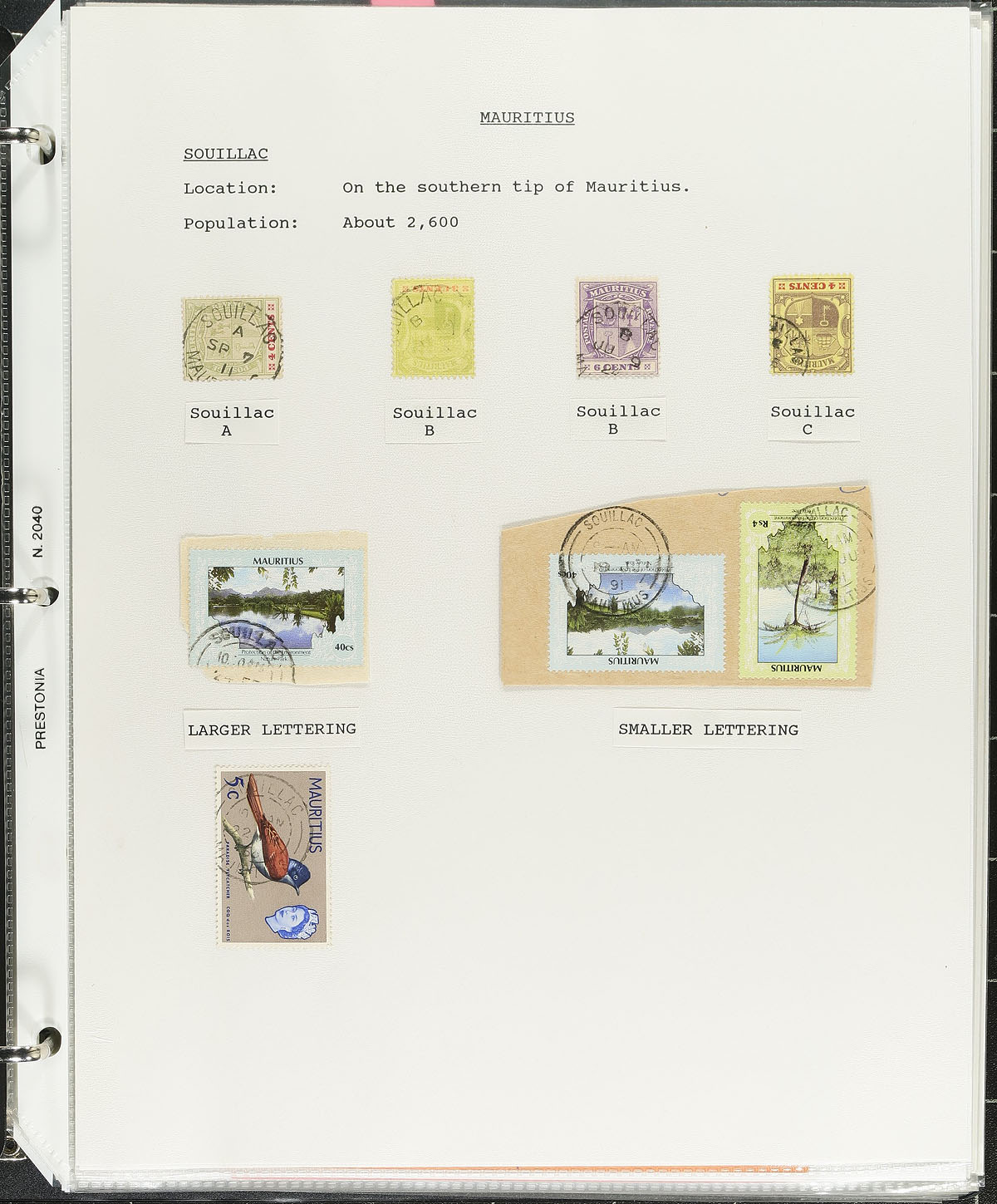 Postmark Study. A lovely, and in depth collection of Mauritius town cancels, 1880's-1980's, containing many hundreds of stamps, on and off piece, and roughly 100 covers and a few postcards, in three volumes. The collection contains roughly 50 different towns, ranging from B to V, including Brisee Verdiere, Camp de Masque, Fressanges, Moka, Vacoas, and much more, with at least one stamp or cover representing each town. The collection also includes maps of various post offices, photos, cancel types and information for a few towns, and more. The lot also includes a photocopy version of "Mauritius, Postal History and Stamps" by Peter Ibbotson, with over 200 pages (including illustrations) showcasing this wonderful area of philately. Surely some better items within, and ideal for the British Commonwealth collector. Estimate =