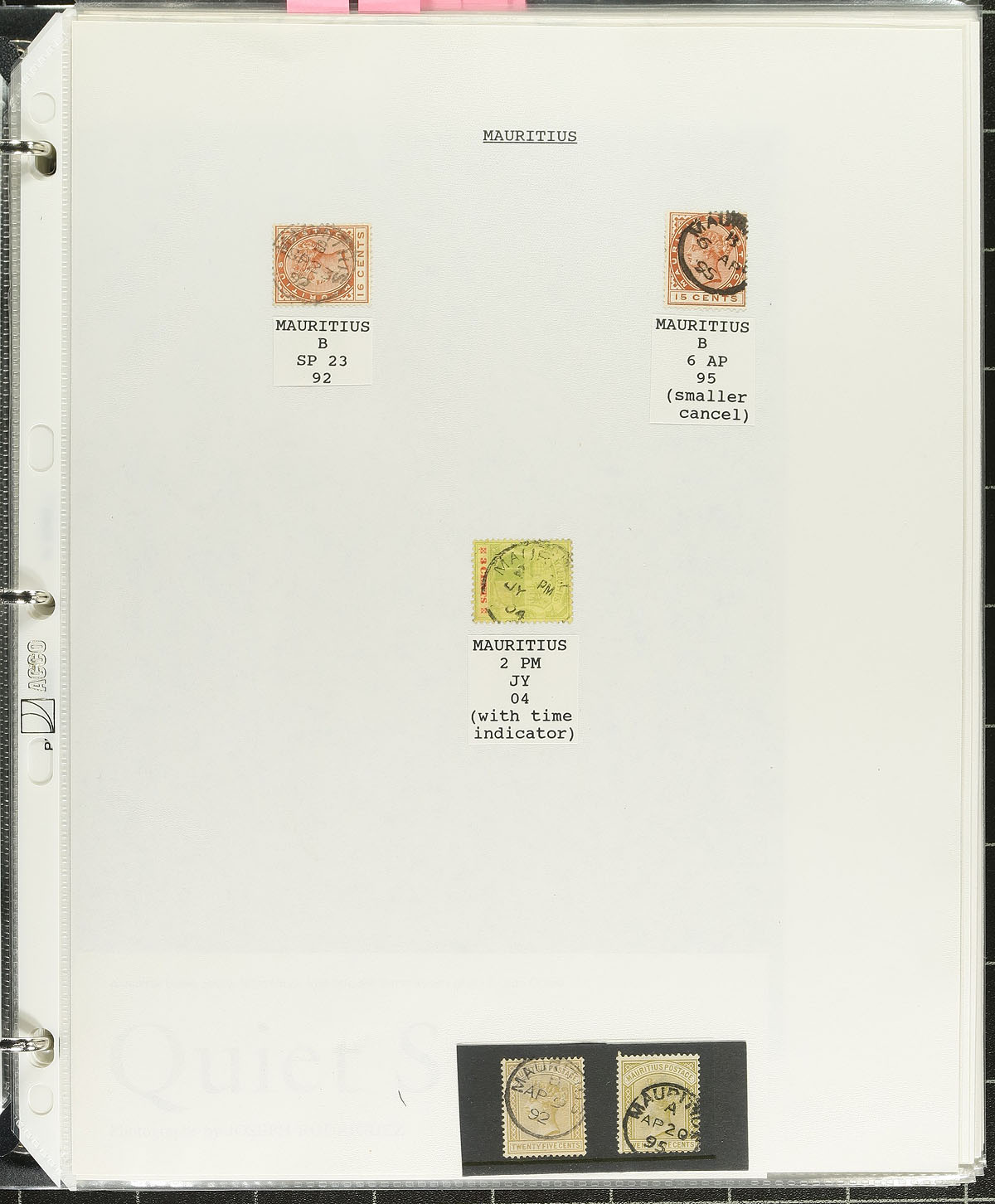 Postmark Study. A lovely, and in depth collection of Mauritius town cancels, 1880's-1980's, containing many hundreds of stamps, on and off piece, and roughly 100 covers and a few postcards, in three volumes. The collection contains roughly 50 different towns, ranging from B to V, including Brisee Verdiere, Camp de Masque, Fressanges, Moka, Vacoas, and much more, with at least one stamp or cover representing each town. The collection also includes maps of various post offices, photos, cancel types and information for a few towns, and more. The lot also includes a photocopy version of "Mauritius, Postal History and Stamps" by Peter Ibbotson, with over 200 pages (including illustrations) showcasing this wonderful area of philately. Surely some better items within, and ideal for the British Commonwealth collector. Estimate =