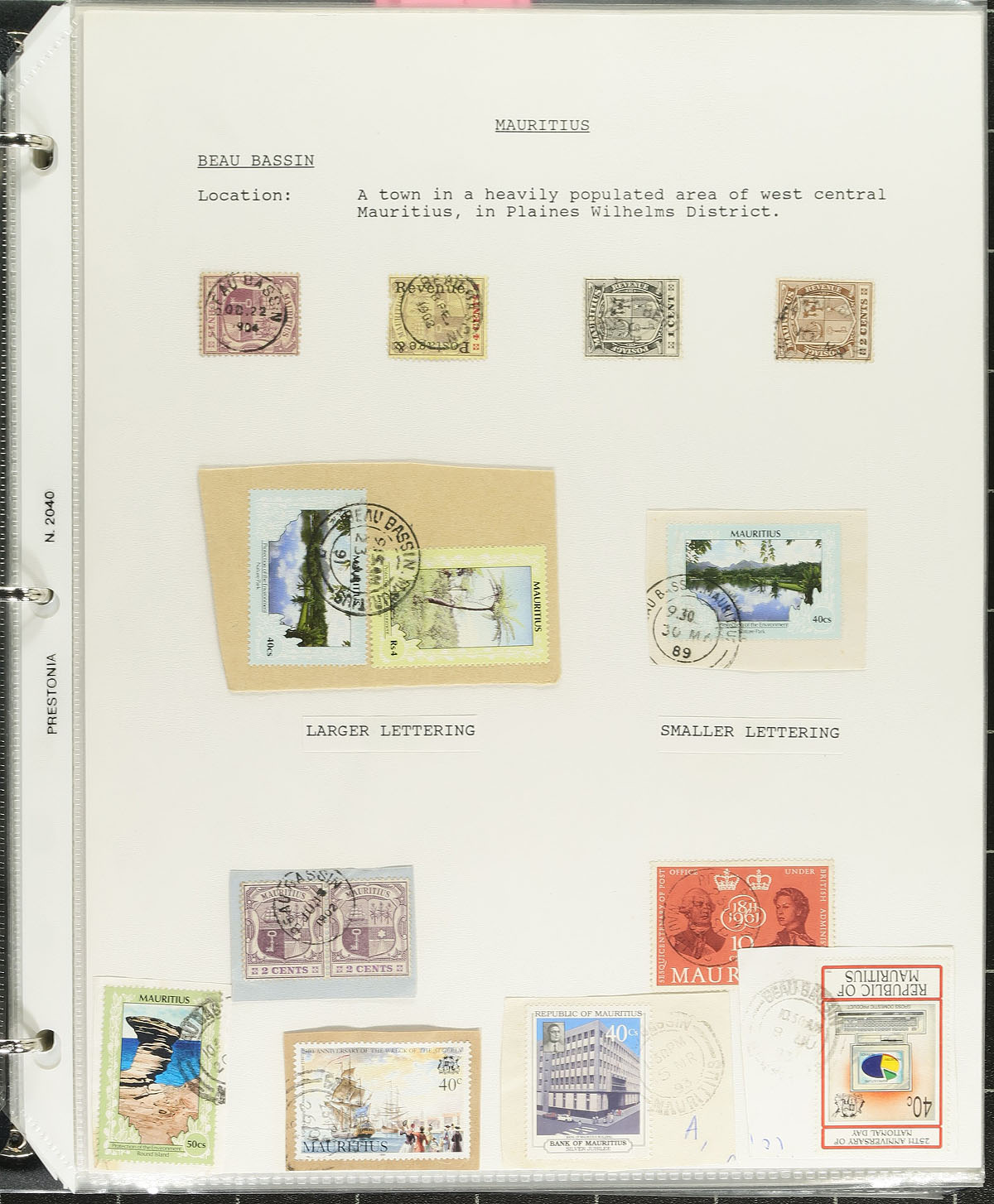 Postmark Study. A lovely, and in depth collection of Mauritius town cancels, 1880's-1980's, containing many hundreds of stamps, on and off piece, and roughly 100 covers and a few postcards, in three volumes. The collection contains roughly 50 different towns, ranging from B to V, including Brisee Verdiere, Camp de Masque, Fressanges, Moka, Vacoas, and much more, with at least one stamp or cover representing each town. The collection also includes maps of various post offices, photos, cancel types and information for a few towns, and more. The lot also includes a photocopy version of "Mauritius, Postal History and Stamps" by Peter Ibbotson, with over 200 pages (including illustrations) showcasing this wonderful area of philately. Surely some better items within, and ideal for the British Commonwealth collector. Estimate =