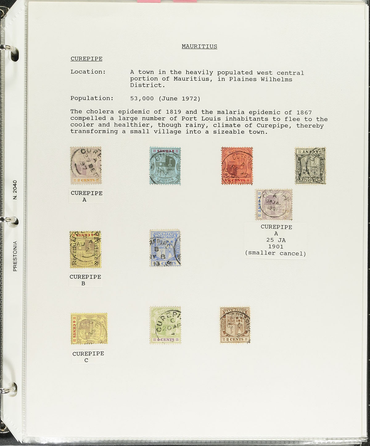 Postmark Study. A lovely, and in depth collection of Mauritius town cancels, 1880's-1980's, containing many hundreds of stamps, on and off piece, and roughly 100 covers and a few postcards, in three volumes. The collection contains roughly 50 different towns, ranging from B to V, including Brisee Verdiere, Camp de Masque, Fressanges, Moka, Vacoas, and much more, with at least one stamp or cover representing each town. The collection also includes maps of various post offices, photos, cancel types and information for a few towns, and more. The lot also includes a photocopy version of "Mauritius, Postal History and Stamps" by Peter Ibbotson, with over 200 pages (including illustrations) showcasing this wonderful area of philately. Surely some better items within, and ideal for the British Commonwealth collector. Estimate =