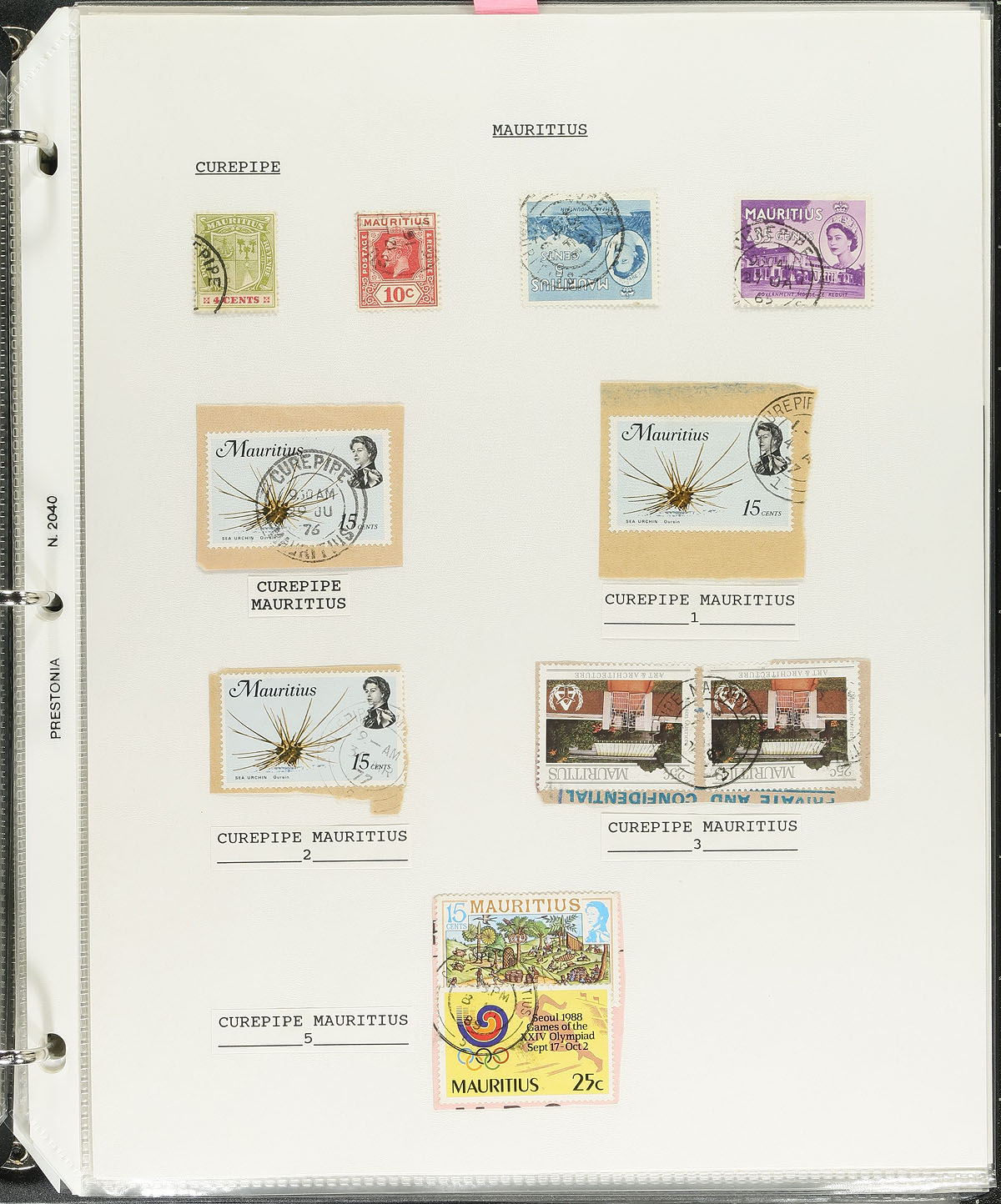 Postmark Study. A lovely, and in depth collection of Mauritius town cancels, 1880's-1980's, containing many hundreds of stamps, on and off piece, and roughly 100 covers and a few postcards, in three volumes. The collection contains roughly 50 different towns, ranging from B to V, including Brisee Verdiere, Camp de Masque, Fressanges, Moka, Vacoas, and much more, with at least one stamp or cover representing each town. The collection also includes maps of various post offices, photos, cancel types and information for a few towns, and more. The lot also includes a photocopy version of "Mauritius, Postal History and Stamps" by Peter Ibbotson, with over 200 pages (including illustrations) showcasing this wonderful area of philately. Surely some better items within, and ideal for the British Commonwealth collector. Estimate =