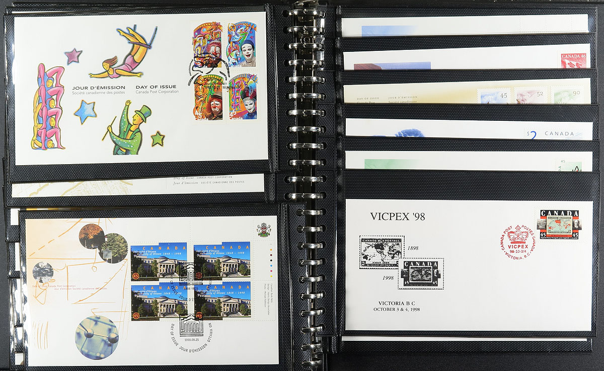 First Day Covers. Nice collection of Canada first day covers, 1972-1998, containing roughly 150 covers in 3 Unisafe albums with slipcases. The collection ranges from Unitrade #561/1766, noting singles, several plate blocks, souvenir sheet and high denomination frankings. Owner's older 2016 Unitrade value for the collection totals $377.00. A nice collection for collectors and dealers alike. Estimate =