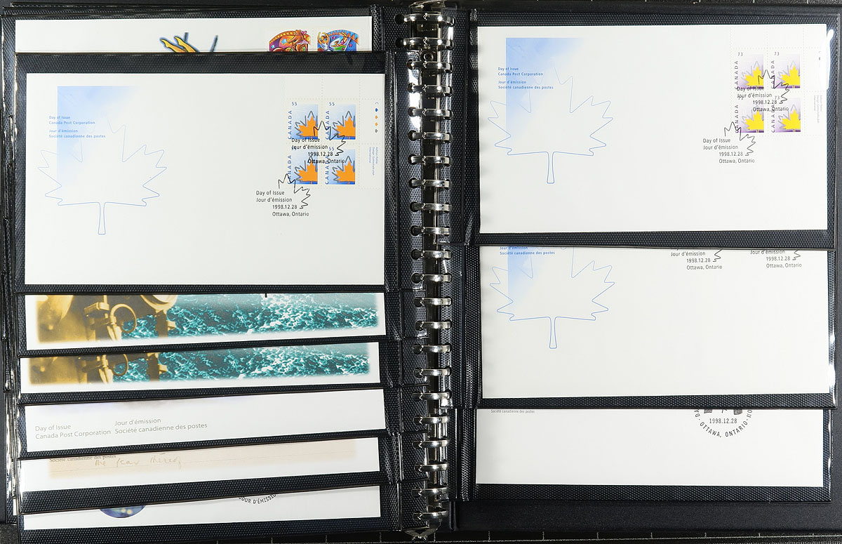 First Day Covers. Nice collection of Canada first day covers, 1972-1998, containing roughly 150 covers in 3 Unisafe albums with slipcases. The collection ranges from Unitrade #561/1766, noting singles, several plate blocks, souvenir sheet and high denomination frankings. Owner's older 2016 Unitrade value for the collection totals $377.00. A nice collection for collectors and dealers alike. Estimate =