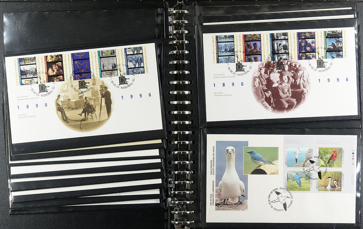 First Day Covers. Nice collection of Canada first day covers, 1972-1998, containing roughly 150 covers in 3 Unisafe albums with slipcases. The collection ranges from Unitrade #561/1766, noting singles, several plate blocks, souvenir sheet and high denomination frankings. Owner's older 2016 Unitrade value for the collection totals $377.00. A nice collection for collectors and dealers alike. Estimate =