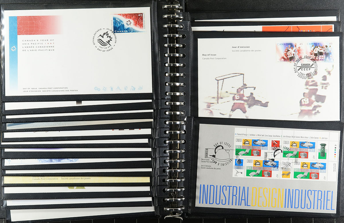 First Day Covers. Nice collection of Canada first day covers, 1972-1998, containing roughly 150 covers in 3 Unisafe albums with slipcases. The collection ranges from Unitrade #561/1766, noting singles, several plate blocks, souvenir sheet and high denomination frankings. Owner's older 2016 Unitrade value for the collection totals $377.00. A nice collection for collectors and dealers alike. Estimate =