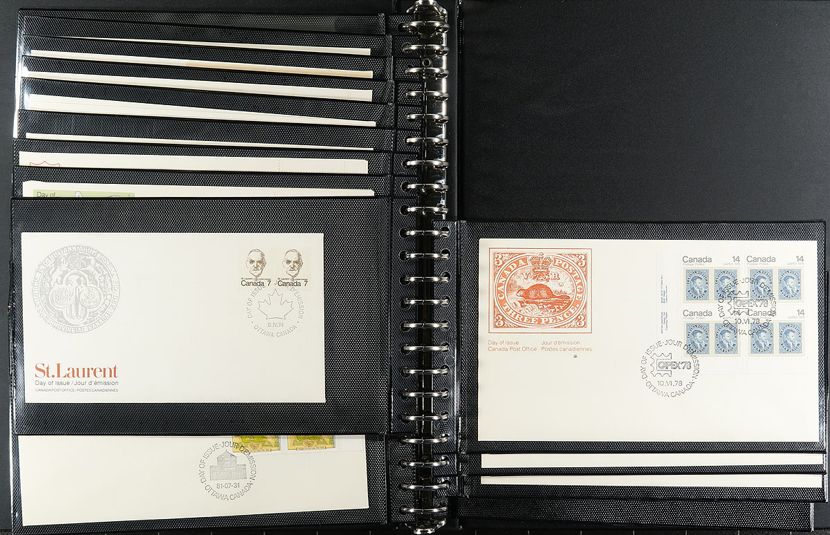 First Day Covers. Nice collection of Canada first day covers, 1972-1998, containing roughly 150 covers in 3 Unisafe albums with slipcases. The collection ranges from Unitrade #561/1766, noting singles, several plate blocks, souvenir sheet and high denomination frankings. Owner's older 2016 Unitrade value for the collection totals $377.00. A nice collection for collectors and dealers alike. Estimate =