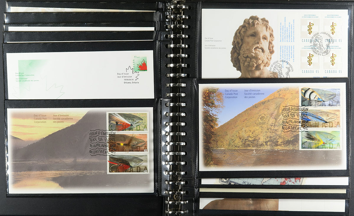 First Day Covers. Nice collection of Canada first day covers, 1972-1998, containing roughly 150 covers in 3 Unisafe albums with slipcases. The collection ranges from Unitrade #561/1766, noting singles, several plate blocks, souvenir sheet and high denomination frankings. Owner's older 2016 Unitrade value for the collection totals $377.00. A nice collection for collectors and dealers alike. Estimate =