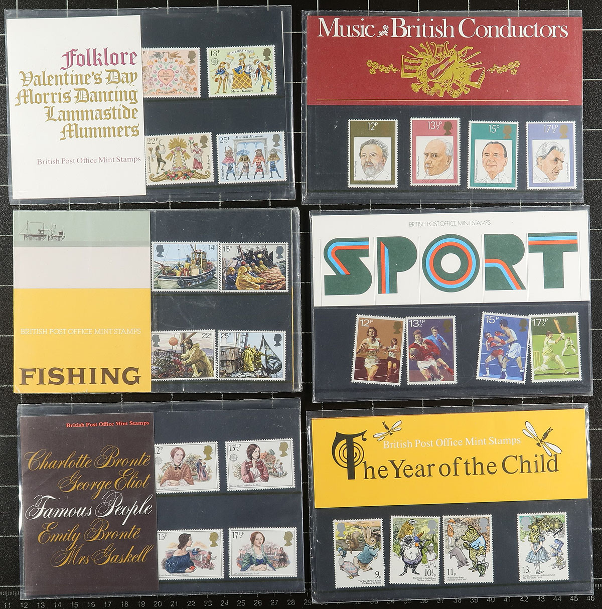 Accumulation of primarily never hinged Great Britain, 1950's-1990's, containing many hundred of stamps in a variety of formats. We note singles, sets, a few booklets, annual collections (from 1986, 1988), a few gutter sheets, a hinged collection on several album pages from the 1980s, and roughly 35 presentation packs from the 1970's to the 1980's. A nice lot that would catalogue several hundreds of pounds, face value alone is approximately £250.00. Ideal for collectors and postage users, overall very fine. Estimate =