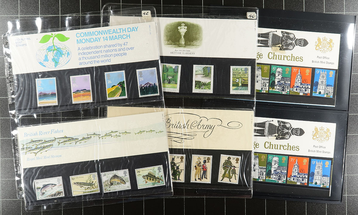 Accumulation of primarily never hinged Great Britain, 1950's-1990's, containing many hundred of stamps in a variety of formats. We note singles, sets, a few booklets, annual collections (from 1986, 1988), a few gutter sheets, a hinged collection on several album pages from the 1980s, and roughly 35 presentation packs from the 1970's to the 1980's. A nice lot that would catalogue several hundreds of pounds, face value alone is approximately £250.00. Ideal for collectors and postage users, overall very fine. Estimate =