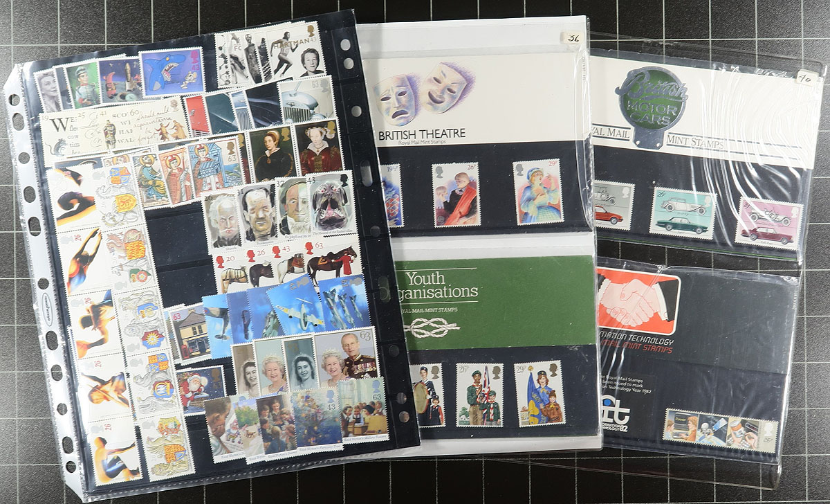 Accumulation of primarily never hinged Great Britain, 1950's-1990's, containing many hundred of stamps in a variety of formats. We note singles, sets, a few booklets, annual collections (from 1986, 1988), a few gutter sheets, a hinged collection on several album pages from the 1980s, and roughly 35 presentation packs from the 1970's to the 1980's. A nice lot that would catalogue several hundreds of pounds, face value alone is approximately £250.00. Ideal for collectors and postage users, overall very fine. Estimate =