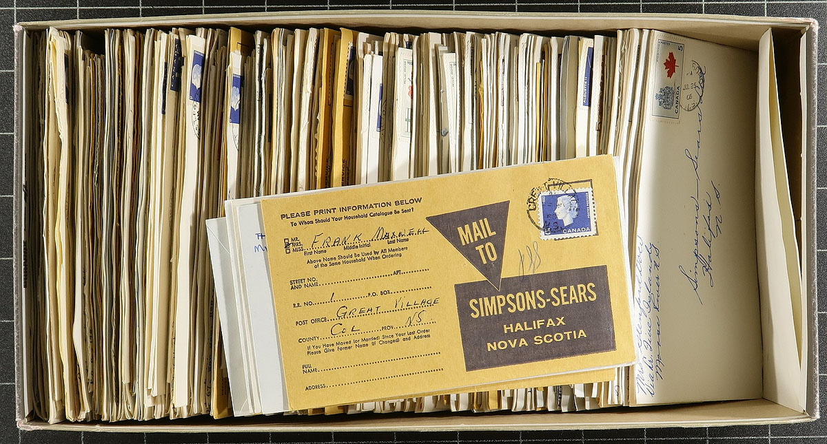 Nova Scotia Postal History. Accumulation of roughly 400 Nova Scotia covers collected for town postmarks, loose in a shoe box, generally ranging from 1964 to 1966. We estimate representation from about 100 different towns, ranging from A to W, including Great Village, Guysborough, Newellton, Queensport, Mabone Bay, Spanish Ship Bay, Reserve Mines, and much more. Postmark interest includes cds, duplex, machine, and perhaps a few others. All the mail is commercial in nature, mostly to Simpsons-Sears in Halifax, with the vast majority having 5c Cameo frankings. A nice lot for the Nova Scotia or Canada postmark collector. Estimate =