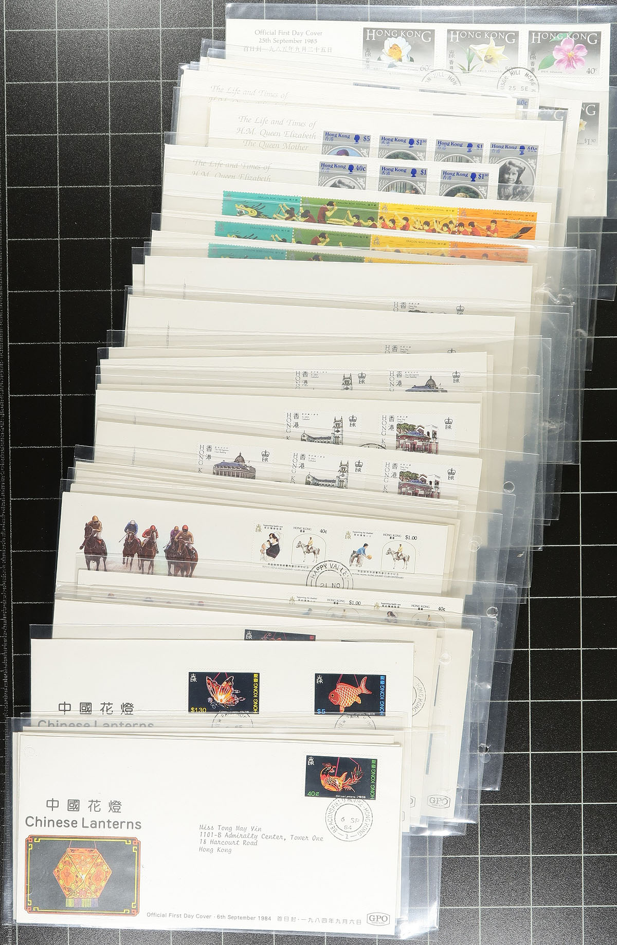 Lovely group of 182 Hong Kong first day covers, 1978-1999, well organized in a shoe box. We note mostly sets, along with singles and souvenir sheet frankings, generally ranging from Scott #349/854, with better representation from the 1980's. Owner's 2026 Scott catalogue value for the lot totals $1,409.00 (counted as used stamps). Some mild duplication for some issues, a nice lot for collectors and dealers alike. 2026 Scott (as stamps) US$1409.00 =