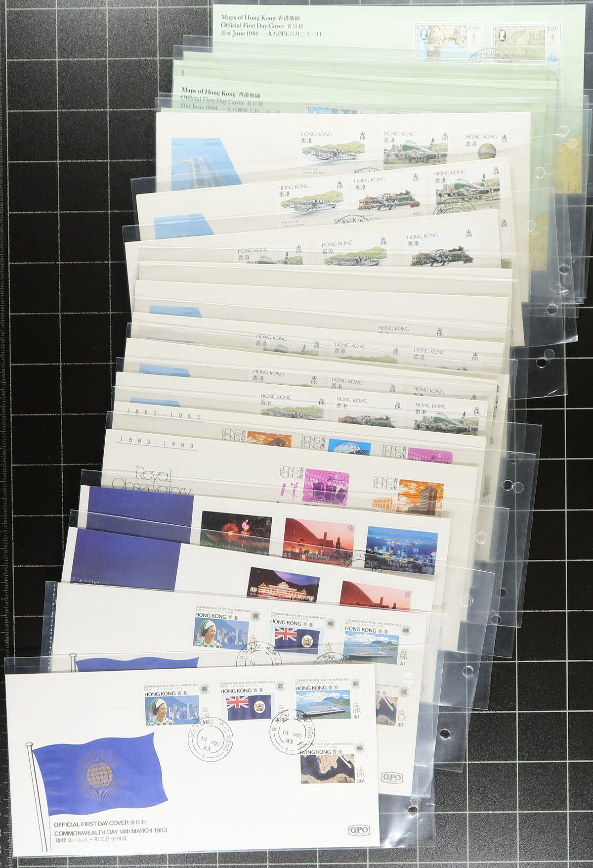 Lovely group of 182 Hong Kong first day covers, 1978-1999, well organized in a shoe box. We note mostly sets, along with singles and souvenir sheet frankings, generally ranging from Scott #349/854, with better representation from the 1980's. Owner's 2026 Scott catalogue value for the lot totals $1,409.00 (counted as used stamps). Some mild duplication for some issues, a nice lot for collectors and dealers alike. 2026 Scott (as stamps) US$1409.00 =