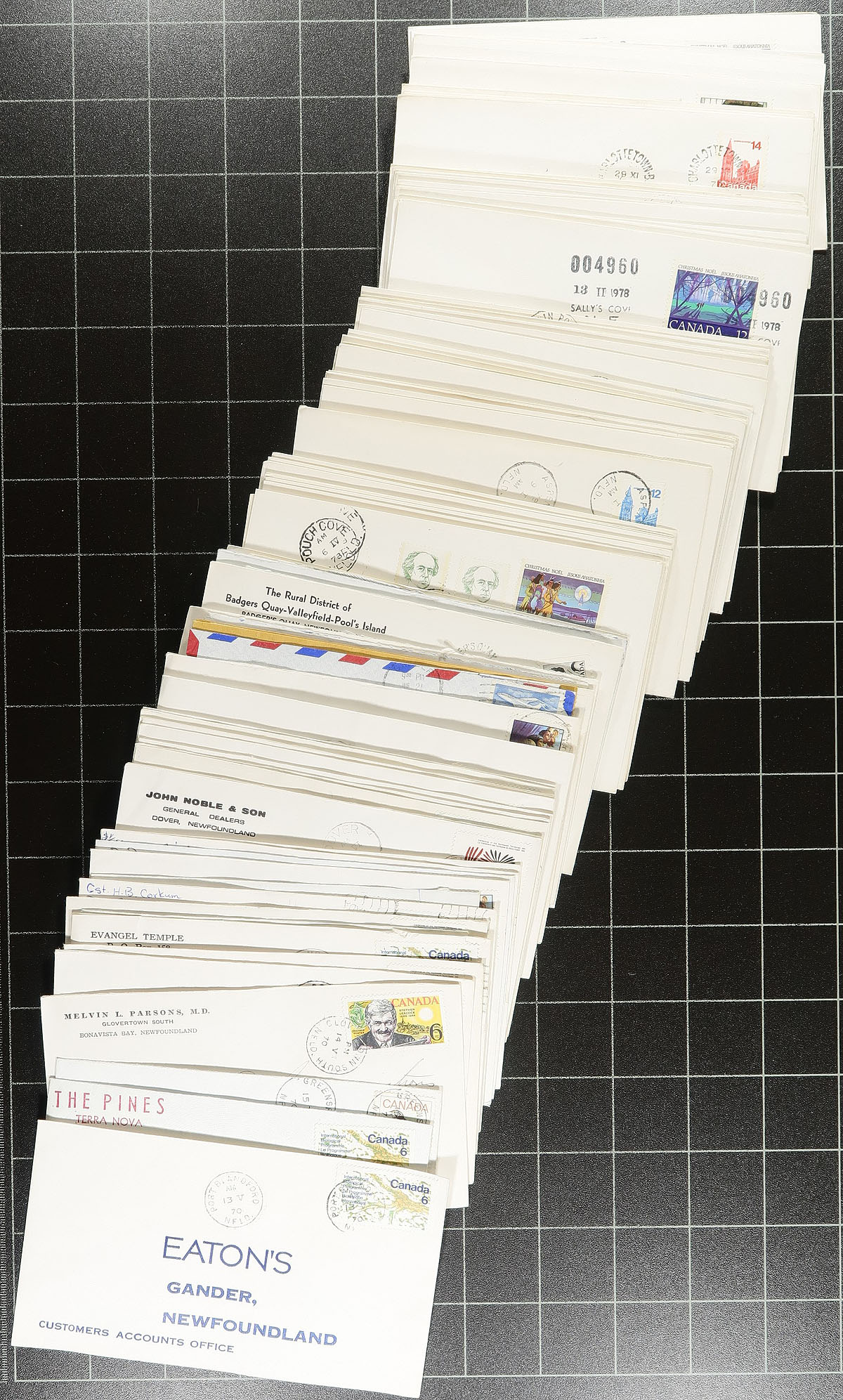 Newfoundland Postmarks. Nice group of roughly 500 covers collected for Newfoundland town postmarks, 1960's-1970's, loose in a box. A cursory check of material indicated a few hundred different towns ranging from A to W including Black Siding, Cappahayden, Paradise River, Freshwater P.B., Fischot Islands, and so many more colourful town names. We note a nice mix of commemorative (1970s), and definitive frankings, along with some corner card advertising with mostly the roughly 100 #10 sized envelopes. Postmark interest includes cds, duplex, POCON, machine, and split ring types. A nice lot for the Newfoundland or Canada postmark collector. Estimate =