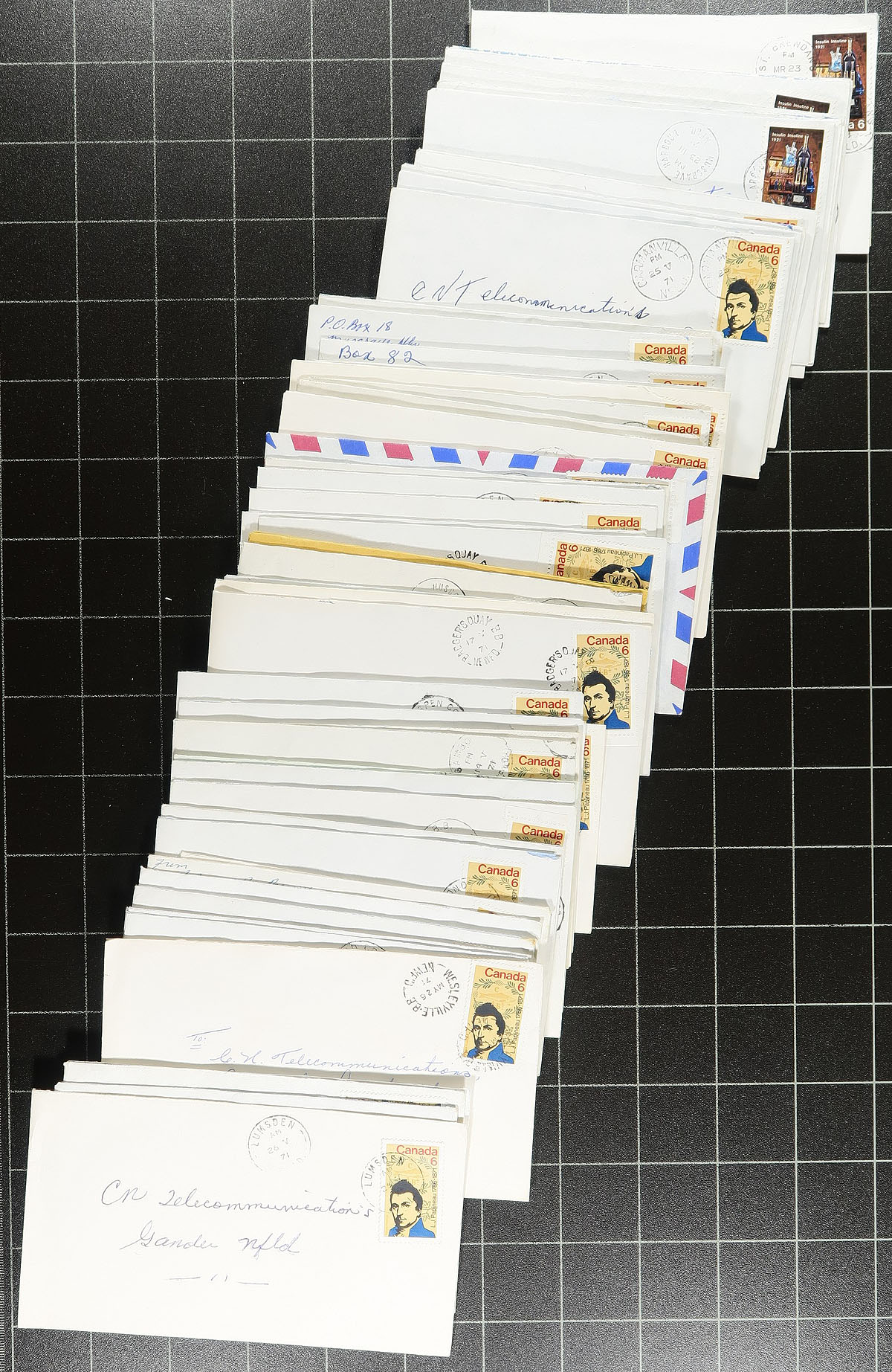 Newfoundland Postmarks. Nice group of roughly 500 covers collected for Newfoundland town postmarks, 1960's-1970's, loose in a box. A cursory check of material indicated a few hundred different towns ranging from A to W including Black Siding, Cappahayden, Paradise River, Freshwater P.B., Fischot Islands, and so many more colourful town names. We note a nice mix of commemorative (1970s), and definitive frankings, along with some corner card advertising with mostly the roughly 100 #10 sized envelopes. Postmark interest includes cds, duplex, POCON, machine, and split ring types. A nice lot for the Newfoundland or Canada postmark collector. Estimate =
