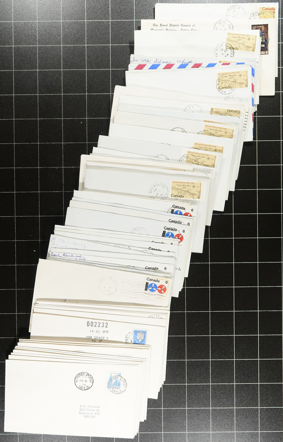 Newfoundland Postmarks. Nice group of roughly 500 covers collected for Newfoundland town postmarks, 1960's-1970's, loose in a box. A cursory check of material indicated a few hundred different towns ranging from A to W including Black Siding, Cappahayden, Paradise River, Freshwater P.B., Fischot Islands, and so many more colourful town names. We note a nice mix of commemorative (1970s), and definitive frankings, along with some corner card advertising with mostly the roughly 100 #10 sized envelopes. Postmark interest includes cds, duplex, POCON, machine, and split ring types. A nice lot for the Newfoundland or Canada postmark collector. Estimate =
