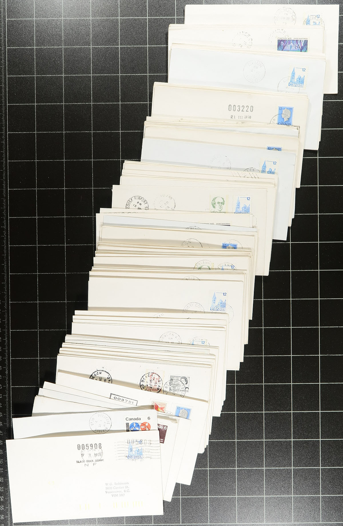 Newfoundland Postmarks. Nice group of roughly 500 covers collected for Newfoundland town postmarks, 1960's-1970's, loose in a box. A cursory check of material indicated a few hundred different towns ranging from A to W including Black Siding, Cappahayden, Paradise River, Freshwater P.B., Fischot Islands, and so many more colourful town names. We note a nice mix of commemorative (1970s), and definitive frankings, along with some corner card advertising with mostly the roughly 100 #10 sized envelopes. Postmark interest includes cds, duplex, POCON, machine, and split ring types. A nice lot for the Newfoundland or Canada postmark collector. Estimate =