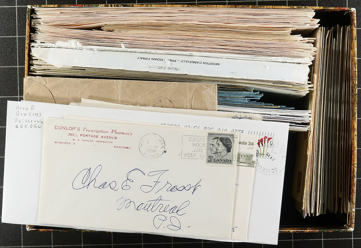 Manitoba Postmarks. Attractive group of roughly 400 covers collected for Manitoba town postmarks, 1950's-1990's, loose in a box. A quick check indicated roughly 100 different towns ranging from A to W including Oxford, Boissevain, Winkler, Douglas, Whitemouth, Swan River, Lyleton, Guy Hill, and much more. Postmark interest includes cds, duplex, slogan, Klussendorf, POCON, and perhaps more. Almost all the covers are commercial in nature (did spot a few first day covers), including several corner advertising envelopes, some commemorative frankings, etc. A nice lot for the Manitoba or Canada postmark collector. Estimate =