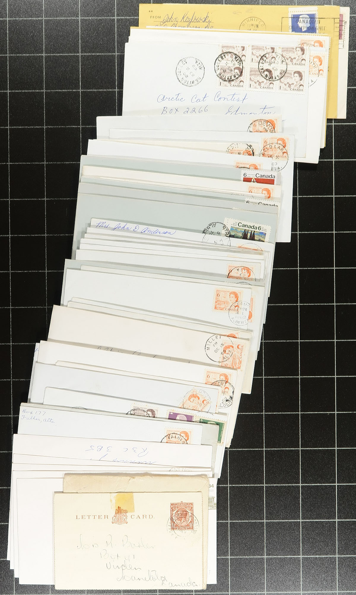 Manitoba Postmarks. Attractive group of roughly 400 covers collected for Manitoba town postmarks, 1950's-1990's, loose in a box. A quick check indicated roughly 100 different towns ranging from A to W including Oxford, Boissevain, Winkler, Douglas, Whitemouth, Swan River, Lyleton, Guy Hill, and much more. Postmark interest includes cds, duplex, slogan, Klussendorf, POCON, and perhaps more. Almost all the covers are commercial in nature (did spot a few first day covers), including several corner advertising envelopes, some commemorative frankings, etc. A nice lot for the Manitoba or Canada postmark collector. Estimate =