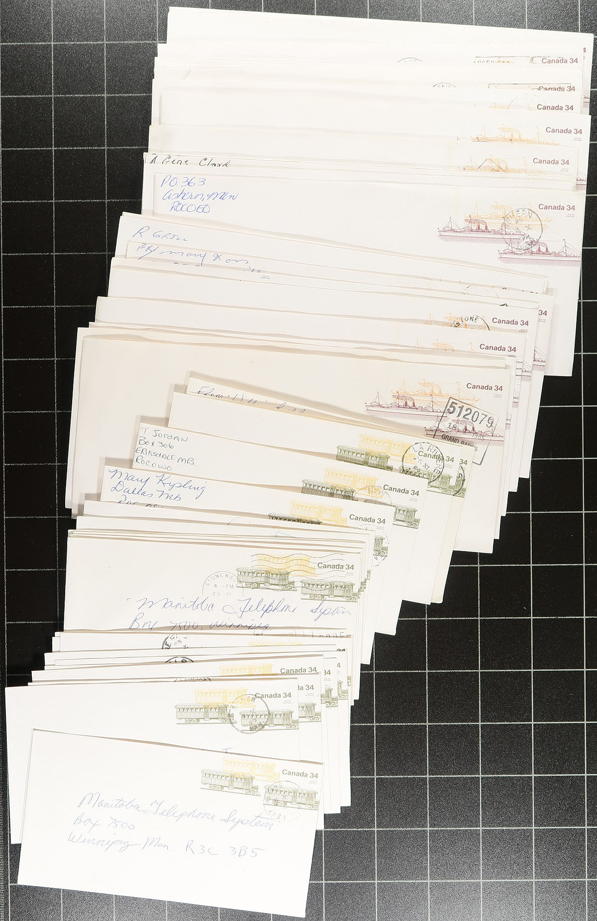 Manitoba Postmarks. Attractive group of roughly 400 covers collected for Manitoba town postmarks, 1950's-1990's, loose in a box. A quick check indicated roughly 100 different towns ranging from A to W including Oxford, Boissevain, Winkler, Douglas, Whitemouth, Swan River, Lyleton, Guy Hill, and much more. Postmark interest includes cds, duplex, slogan, Klussendorf, POCON, and perhaps more. Almost all the covers are commercial in nature (did spot a few first day covers), including several corner advertising envelopes, some commemorative frankings, etc. A nice lot for the Manitoba or Canada postmark collector. Estimate =