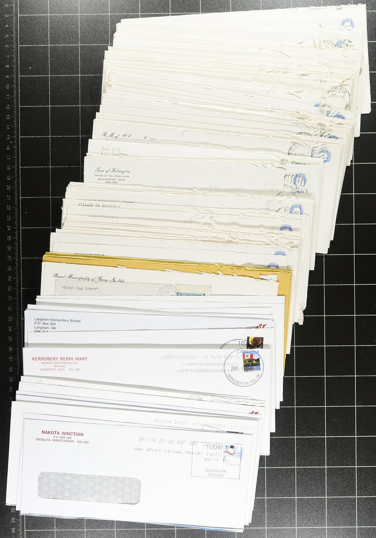 Saskatchewan Postmarks. Accumulation of roughly 500 covers collected for Saskatchewan town postmarks, 1950's-2005, loose in a box. A cursory check indicated roughly 100 different towns ranging from A to W including Watson, La Ronge, Langham, Muskoday First Nation, Frontier, Gull Lake, Wilkie, and more. Postmark interest includes cds, duplex, POCON, machine, Pictorial, and perhaps a few others. The material appears to mostly be post-2000's, with some duplication for some towns, along with several corner advertising envelopes. A few faults as almost all the covers are #10 sized envelopes, still a nice lot for the Saskatchewan or Canada postmark collector. Estimate =