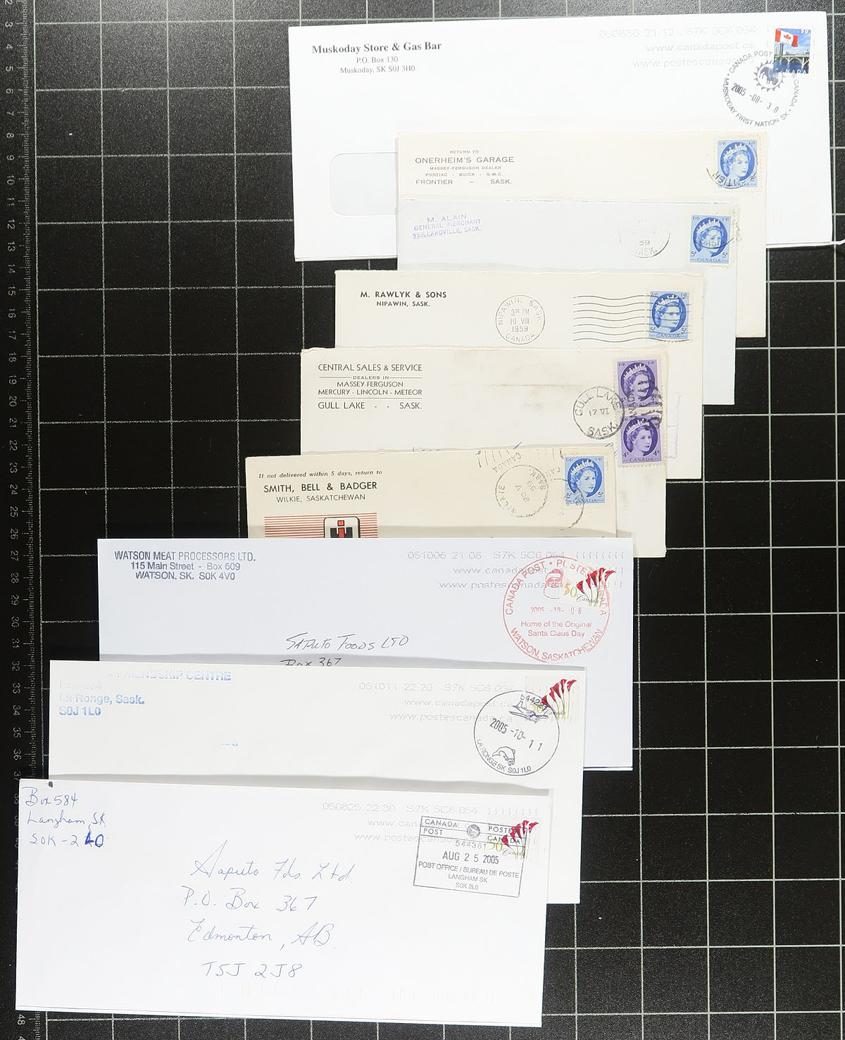 Saskatchewan Postmarks. Accumulation of roughly 500 covers collected for Saskatchewan town postmarks, 1950's-2005, loose in a box. A cursory check indicated roughly 100 different towns ranging from A to W including Watson, La Ronge, Langham, Muskoday First Nation, Frontier, Gull Lake, Wilkie, and more. Postmark interest includes cds, duplex, POCON, machine, Pictorial, and perhaps a few others. The material appears to mostly be post-2000's, with some duplication for some towns, along with several corner advertising envelopes. A few faults as almost all the covers are #10 sized envelopes, still a nice lot for the Saskatchewan or Canada postmark collector. Estimate =