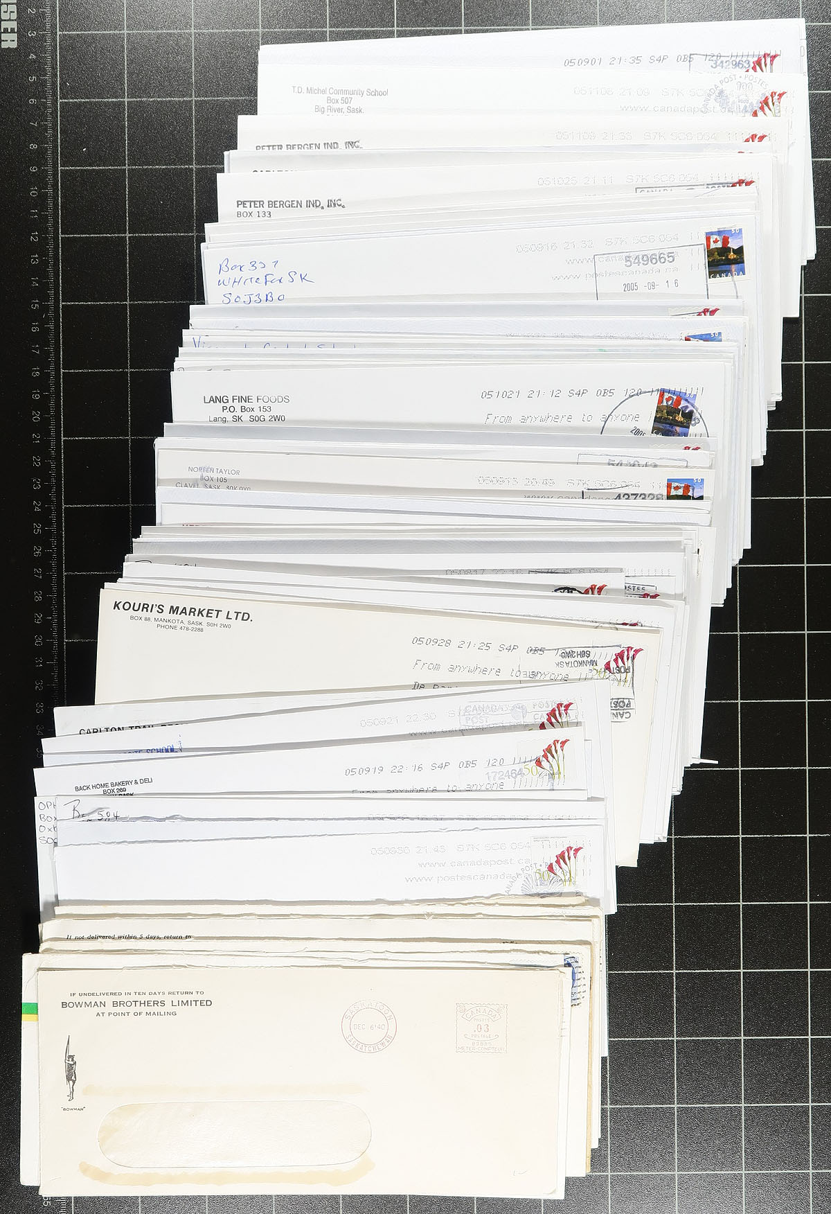 Saskatchewan Postmarks. Accumulation of roughly 500 covers collected for Saskatchewan town postmarks, 1950's-2005, loose in a box. A cursory check indicated roughly 100 different towns ranging from A to W including Watson, La Ronge, Langham, Muskoday First Nation, Frontier, Gull Lake, Wilkie, and more. Postmark interest includes cds, duplex, POCON, machine, Pictorial, and perhaps a few others. The material appears to mostly be post-2000's, with some duplication for some towns, along with several corner advertising envelopes. A few faults as almost all the covers are #10 sized envelopes, still a nice lot for the Saskatchewan or Canada postmark collector. Estimate =
