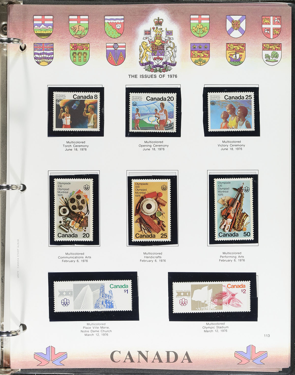 Collection of never hinged Canada in two Unity stamp albums. The collection contains several hundreds of stamps in hingeless mounts, ranging from Scott #562/1337, with album pages ranging from 1851 to 1999. Face value for the collection totals just over $150.00, with strength in the 1980's issues. A nice starter collection in two quality stamp albums that would retail for a few hundred dollars alone. Estimate =