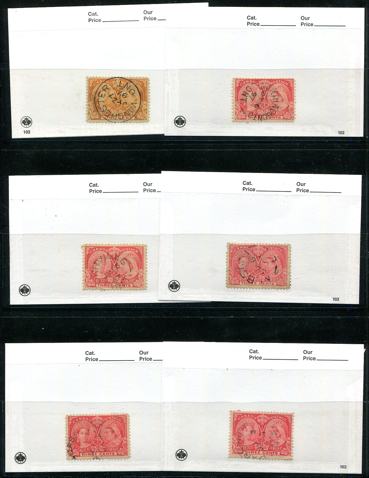 "Socked on the Nose" 1897 Jubilee stamp holding. An attractive accumulation of 65x 1897 Queen Victoria Jubilee issue 1c to 3c values (primarily 3c), all selected for postmarks. Noted Squared Circles, Split Rings, CDS and RPO. Several better including Alberni BC, Billings Bridge ONT, Utica ONT, Stubbs Bay QUE, North Toronto ONT, Tyne Valley PEI, New Denver BC, Prince Albert SASK (Territorial), Alexander MAN, Joggin Mines NS, Enderby BC etc. All arranged on a couple of stocksheets, plus "102" cards. Estimate =