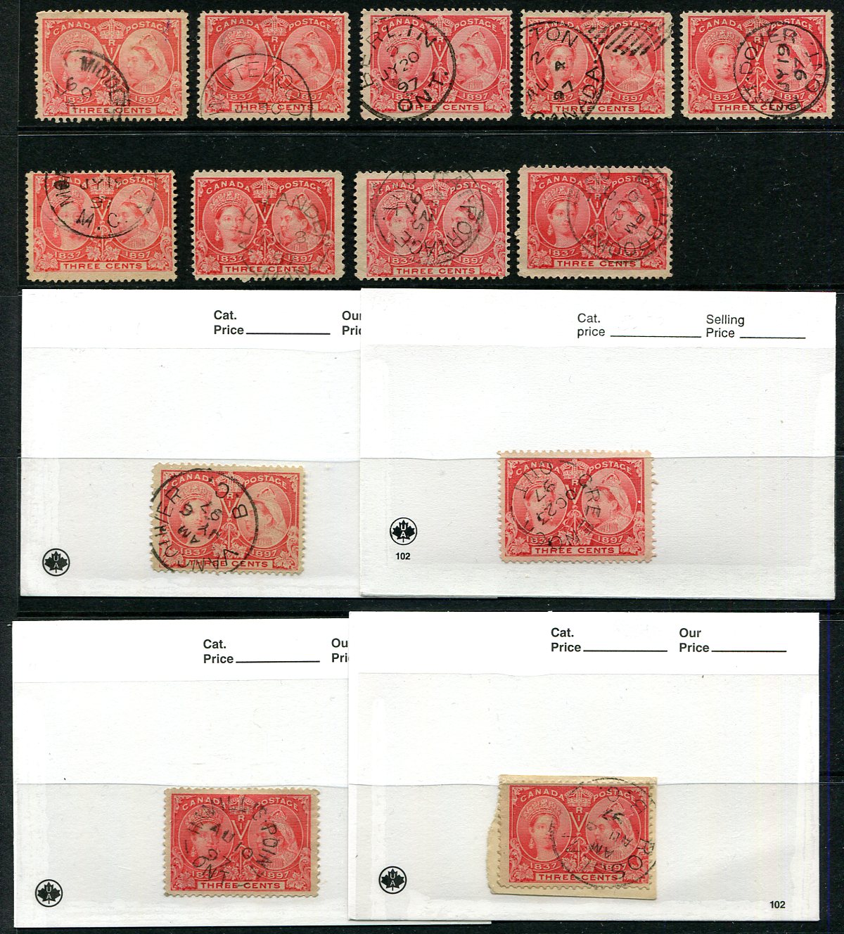 "Socked on the Nose" 1897 Jubilee stamp holding. An attractive accumulation of 65x 1897 Queen Victoria Jubilee issue 1c to 3c values (primarily 3c), all selected for postmarks. Noted Squared Circles, Split Rings, CDS and RPO. Several better including Alberni BC, Billings Bridge ONT, Utica ONT, Stubbs Bay QUE, North Toronto ONT, Tyne Valley PEI, New Denver BC, Prince Albert SASK (Territorial), Alexander MAN, Joggin Mines NS, Enderby BC etc. All arranged on a couple of stocksheets, plus "102" cards. Estimate =