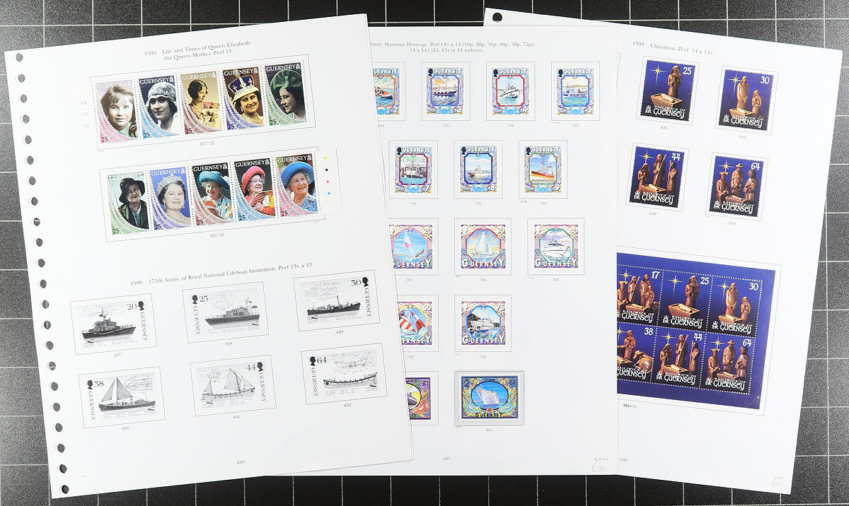 Nice collection of primarily never hinged Guernsey, 1975-2005, containing many hundreds of stamps in several album or stock pages, and annual collections. The lot generally ranges from Scott #137/502,noting many sets, a few souvenir sheets, gutter pairs, and 5 annual collections from 1990 to 1994. The collection appears to be complete from 1979 to 1999 (some mint hinged material from 1998-1999), with owner's 2015 Scott catalogue value for the collection totalling US$760.00. A lovely lot for collectors and dealers alike. Estimate =