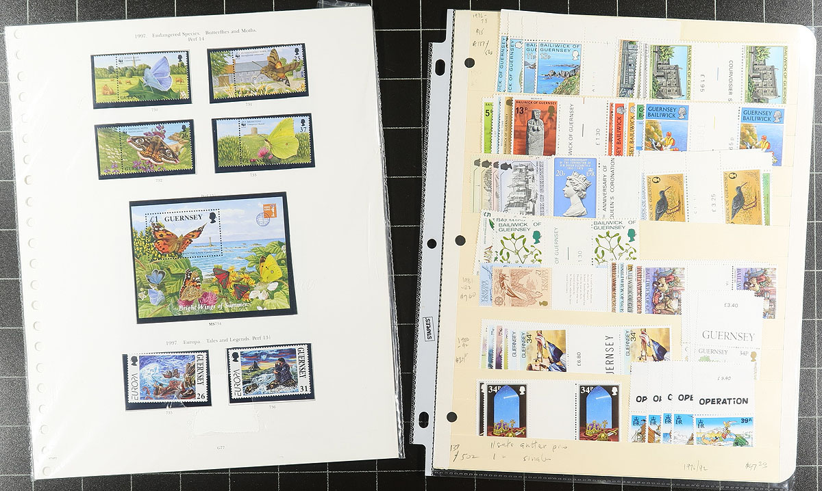 Nice collection of primarily never hinged Guernsey, 1975-2005, containing many hundreds of stamps in several album or stock pages, and annual collections. The lot generally ranges from Scott #137/502,noting many sets, a few souvenir sheets, gutter pairs, and 5 annual collections from 1990 to 1994. The collection appears to be complete from 1979 to 1999 (some mint hinged material from 1998-1999), with owner's 2015 Scott catalogue value for the collection totalling US$760.00. A lovely lot for collectors and dealers alike. Estimate =
