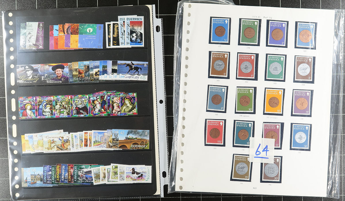 Nice collection of primarily never hinged Guernsey, 1975-2005, containing many hundreds of stamps in several album or stock pages, and annual collections. The lot generally ranges from Scott #137/502,noting many sets, a few souvenir sheets, gutter pairs, and 5 annual collections from 1990 to 1994. The collection appears to be complete from 1979 to 1999 (some mint hinged material from 1998-1999), with owner's 2015 Scott catalogue value for the collection totalling US$760.00. A lovely lot for collectors and dealers alike. Estimate =