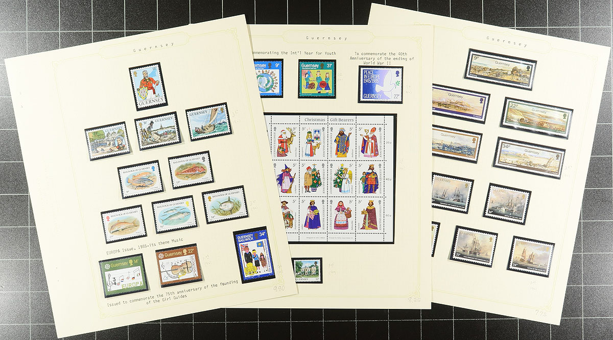 Nice collection of primarily never hinged Guernsey, 1975-2005, containing many hundreds of stamps in several album or stock pages, and annual collections. The lot generally ranges from Scott #137/502,noting many sets, a few souvenir sheets, gutter pairs, and 5 annual collections from 1990 to 1994. The collection appears to be complete from 1979 to 1999 (some mint hinged material from 1998-1999), with owner's 2015 Scott catalogue value for the collection totalling US$760.00. A lovely lot for collectors and dealers alike. Estimate =