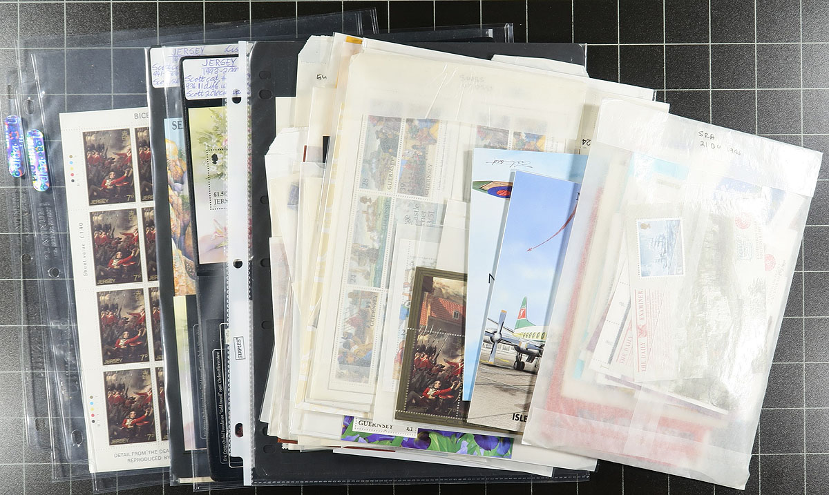 Lovely group of primarily never hinged souvenir sheets and sheetlets, 1970's-2000, containing roughly 250 items in stockpages and glassines. The lot contains material from Guernsey and Jersey, along with a few from Isle of Man, noting several items cataloging $5 to $10 each, including two Isle of Man groups of sheetlets in special post office folders. Only some of the material has been catalogued by the owner from an older Scott catalogue and totals US$1,119.00 , leaving value on the table for collectors and dealers alike. Some duplication up to 8 for some issues, with a few having cto post office cancels, overall very fine. Estimate =