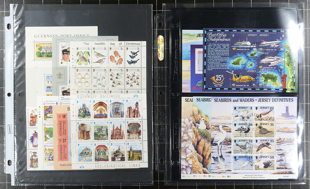 Lovely group of primarily never hinged souvenir sheets and sheetlets, 1970's-2000, containing roughly 250 items in stockpages and glassines. The lot contains material from Guernsey and Jersey, along with a few from Isle of Man, noting several items cataloging $5 to $10 each, including two Isle of Man groups of sheetlets in special post office folders. Only some of the material has been catalogued by the owner from an older Scott catalogue and totals US$1,119.00 , leaving value on the table for collectors and dealers alike. Some duplication up to 8 for some issues, with a few having cto post office cancels, overall very fine. Estimate =