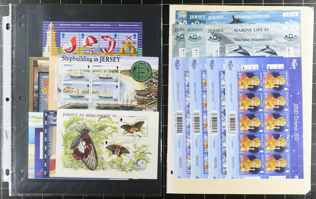 Lovely group of primarily never hinged souvenir sheets and sheetlets, 1970's-2000, containing roughly 250 items in stockpages and glassines. The lot contains material from Guernsey and Jersey, along with a few from Isle of Man, noting several items cataloging $5 to $10 each, including two Isle of Man groups of sheetlets in special post office folders. Only some of the material has been catalogued by the owner from an older Scott catalogue and totals US$1,119.00 , leaving value on the table for collectors and dealers alike. Some duplication up to 8 for some issues, with a few having cto post office cancels, overall very fine. Estimate =