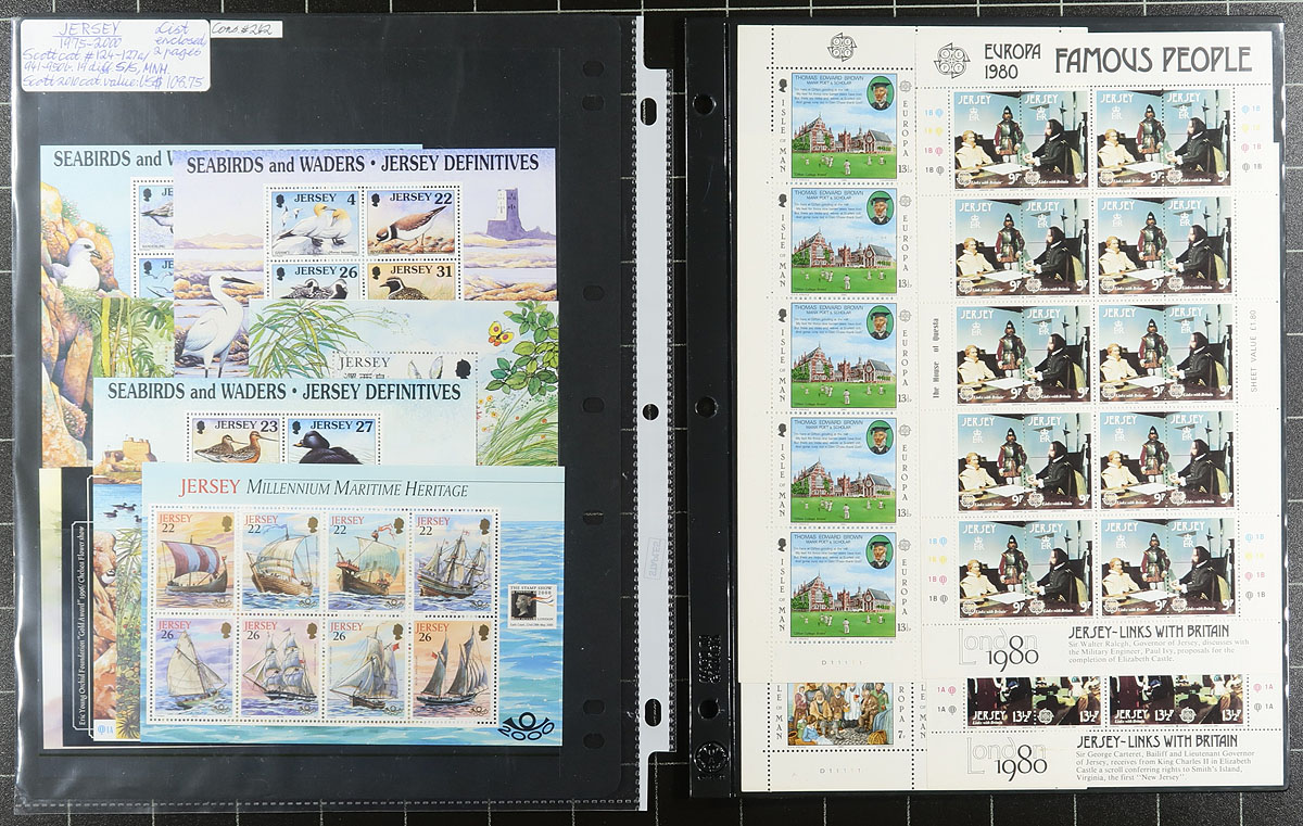 Lovely group of primarily never hinged souvenir sheets and sheetlets, 1970's-2000, containing roughly 250 items in stockpages and glassines. The lot contains material from Guernsey and Jersey, along with a few from Isle of Man, noting several items cataloging $5 to $10 each, including two Isle of Man groups of sheetlets in special post office folders. Only some of the material has been catalogued by the owner from an older Scott catalogue and totals US$1,119.00 , leaving value on the table for collectors and dealers alike. Some duplication up to 8 for some issues, with a few having cto post office cancels, overall very fine. Estimate =