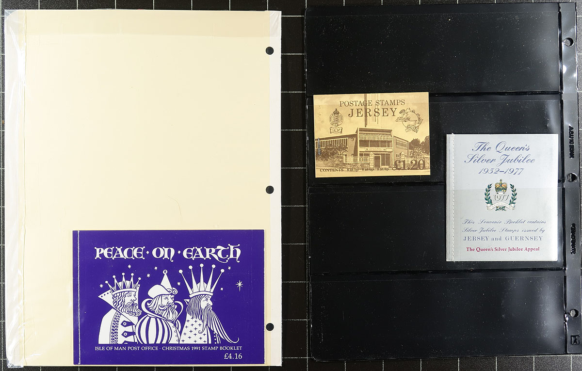 Clean group of Channel Islands complete booklets, 1970's-2005, containing roughly 130 items in stockpages and glassines. The lot contains material from Guernsey, Jersey, Isle of Man, and a few from Alderney, with some identified using Scott numbers along with older catalogue values, noting several prestige booklets, with a spot check indicating some material cataloguing $15 to $25 each. Most of the material has been catalogued by the owner from a 2015 Scott catalogue totaling US$1,226.00. Some duplication throughout, generally up to 3 for some booklets. Clean and very fine. Estimate =