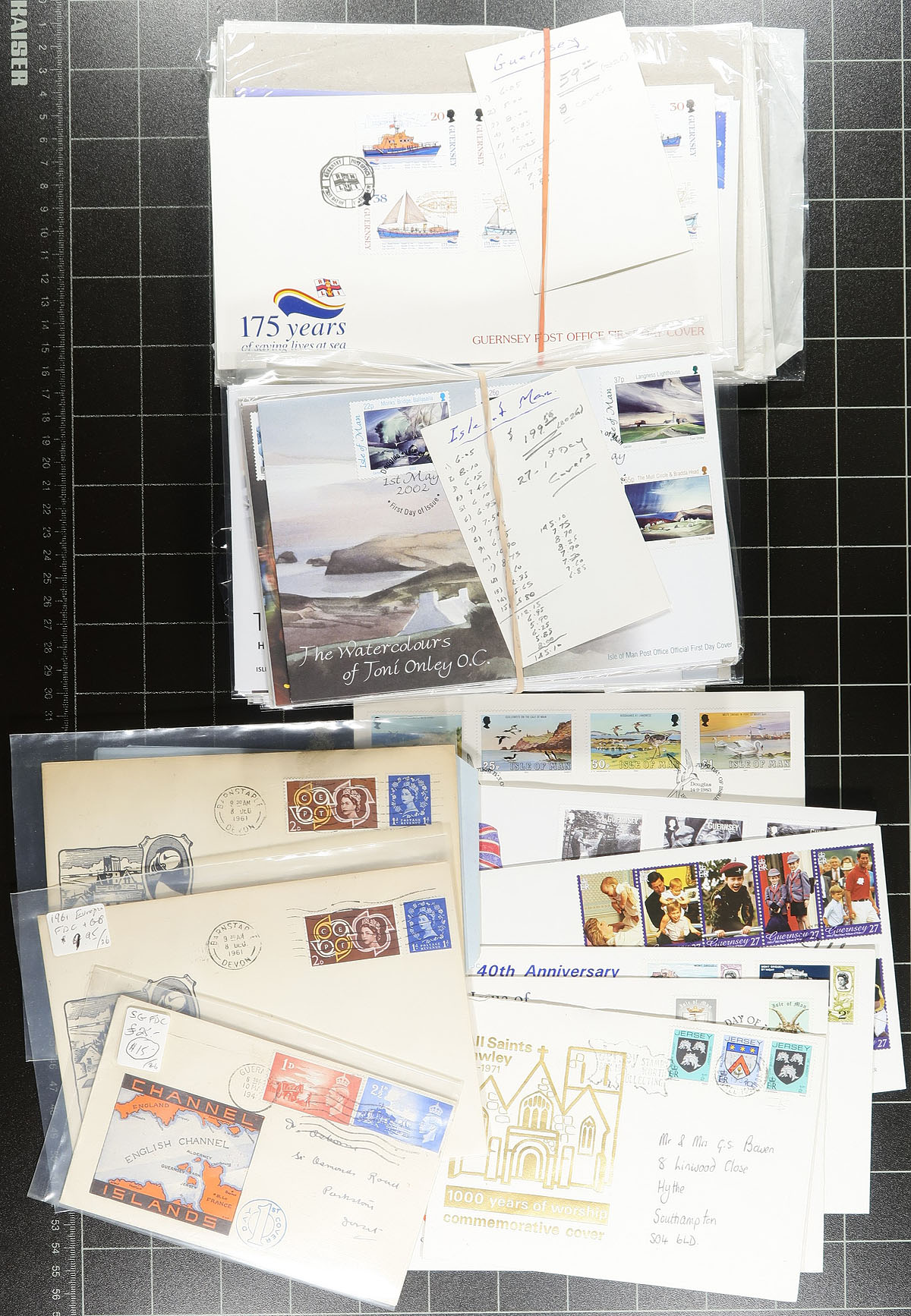 Nice group of Channel Islands first day covers, 1940's-2005, containing roughly 280 covers in an album and loose material in a box. We note representation from Guernsey, Isle of Man, and Jersey, noting mostly sets and souvenir sheet frankings, the majority from the late 1980's to 2000, along with a few from the 1940's (including postage dues). A few early covers have been priced in the $10 to $20 range each, with owner's 2019 Scott catalogue value for the modern covers totaling US$1,054.00 (counted for used stamps). A nice clean lot for collectors and dealers alike. Estimate =