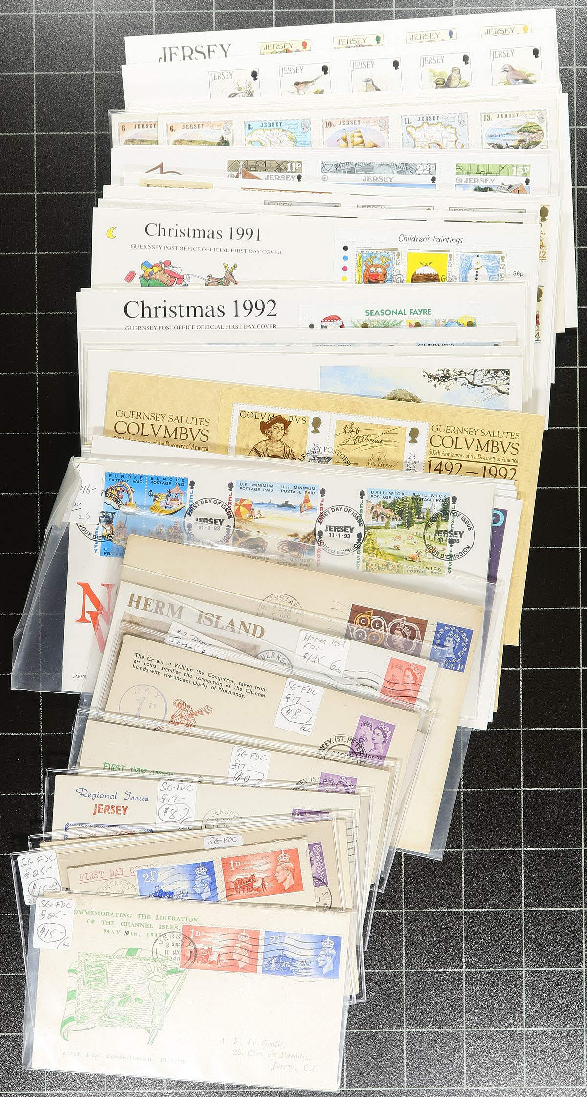 Nice group of Channel Islands first day covers, 1940's-2005, containing roughly 280 covers in an album and loose material in a box. We note representation from Guernsey, Isle of Man, and Jersey, noting mostly sets and souvenir sheet frankings, the majority from the late 1980's to 2000, along with a few from the 1940's (including postage dues). A few early covers have been priced in the $10 to $20 range each, with owner's 2019 Scott catalogue value for the modern covers totaling US$1,054.00 (counted for used stamps). A nice clean lot for collectors and dealers alike. Estimate =